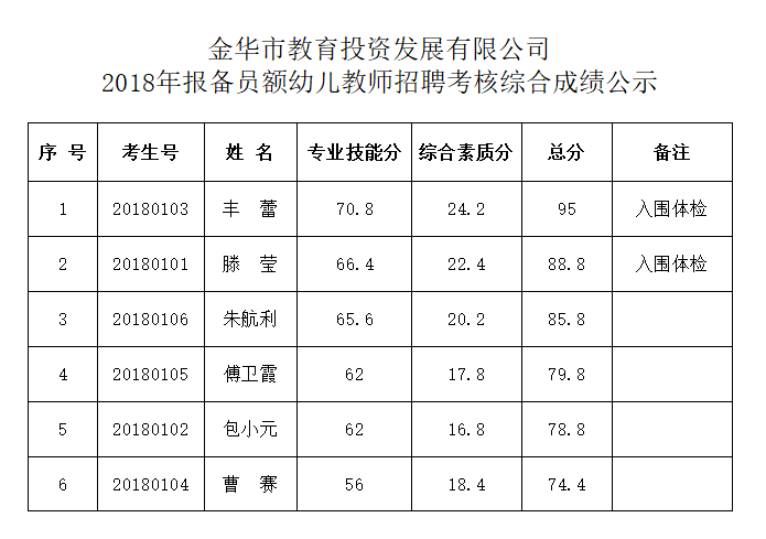 金華市教育投資發展有限公司2018年報備員額幼兒教師招聘考核綜合成績公示